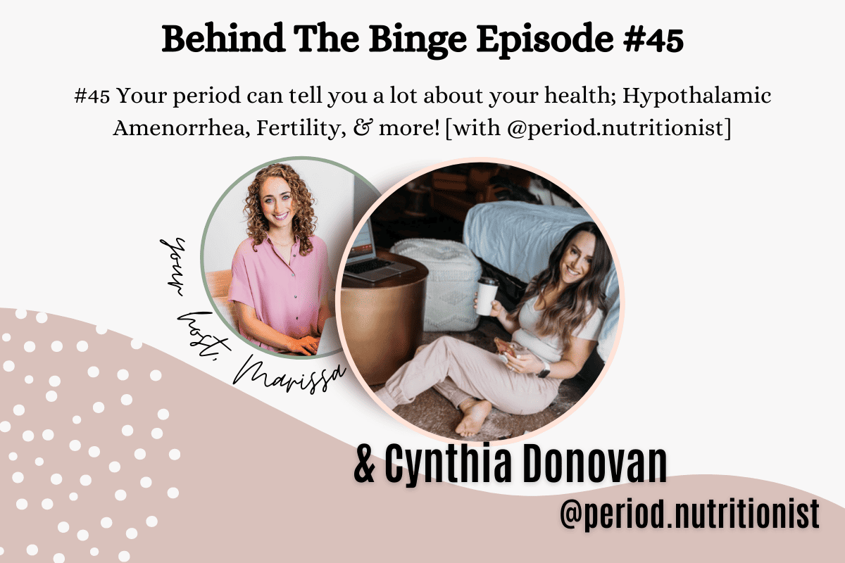 Today we are getting real by talking about your menstrual health. Did you know that missing a period or having irregular periods may be a very critical sign that there is a struggle within your relationship with food? I wanted to bring on someone who specializes in this topic to share how your menstrual cycle can be used as a fit vital sign, and trust me when I say that there is no one better to invite on the pod to have this conversation with than the period nutritionist, Cynthia Donovan.