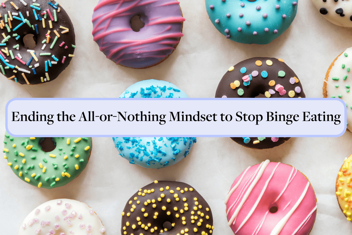 The all-or-nothing mentality is binary thinking that simplifies complex ideas. For example good/bad, right/wrong, always/never. This can contribute to binge eating.