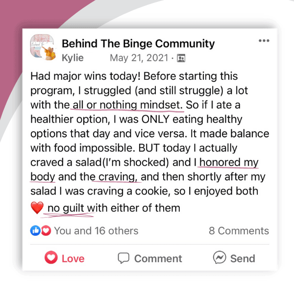 The most important thing I learned was being flexible and letting go of control to make peace with food and my body. My why for taking this journey was to have more fun, explore, travel and not hold myself back from enjoying because of fear of food. I am doing that now and growing everyday! I am thankful for Marissa for sharing all her knowledge and experience.